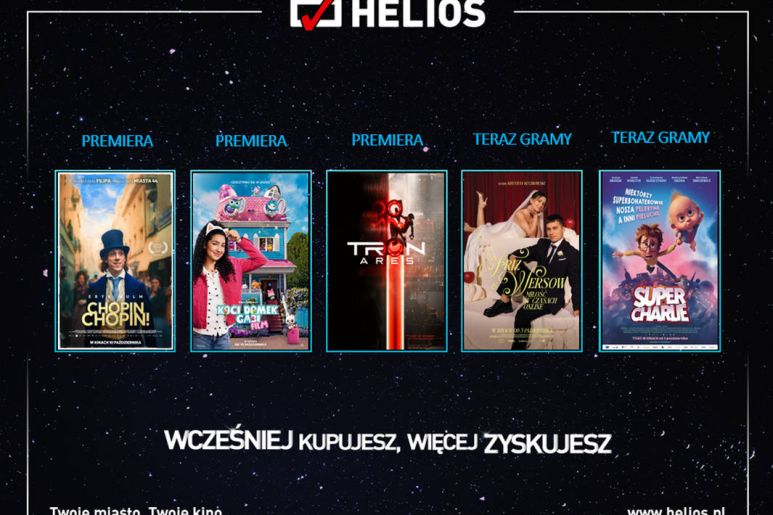 W zbliżającym się tygodniu na wielkich ekranach pojawią się aż trzy różnorodne premiery: „Chopin, Chopin!”, „Tron: Ares” i „Koci domek Gabi: Film”. Emocje sięgną zenitu, a podsycą je inne tytuły już obecne w repertuarze, jak również projekty specjalne, takie jak Helios dla Dzieci i Kultura Dostępna. Ponadto sieć zachęca do udziału w filmowych konkursach!