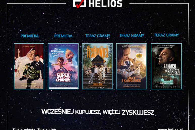 Na widzów kin Helios czekają też nowości z ostatnich tygodni. „Zamach na papieża” to najnowszy film Władysława Pasikowskiego, inspirowany kulisami operacji służb specjalnych dotyczącej zamachu na Jana Pawła II. W centrum wydarzeń stoi Konstanty „Bruno” Brusicki, były snajper, którego zadaniem jest zlikwidowanie zamachowca Alego Agcy i zatarcie śladów. Wewnętrzny konflikt bohatera stawia jednak pod znakiem zapytania powodzenie misji. W głównej roli występuje Bogusław Linda. Nadal w repertuarze sieci można znaleźć komedię „Teściowie 3” – przebojowa kontynuacja lubianej serii tym razem skupia się na chrzcinach wnuka tytułowych bohaterów. Rodzinne świętowanie ukazuje niedokończone sprawy z przeszłości, których rozwiązywanie przynosi liczne zabawne sytuacje.