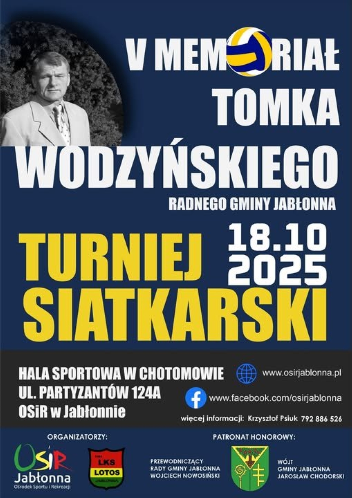 Ośrodek Sportu i Rekreacji w Jabłonnie wraz z LKS LOTOS Jabłonna zapraszają już 18 października 2025 r. od godz. 09:30 do Hali Sportowej w Chotomowie przy ulicy Partyzantów 124A na V Memoriał siatkarski poświęcony pamięci zmarłemu w 2021 roku Tomaszowi Wodzyńskiemu, wieloletniemu radnemu Gminy Jabłonna.