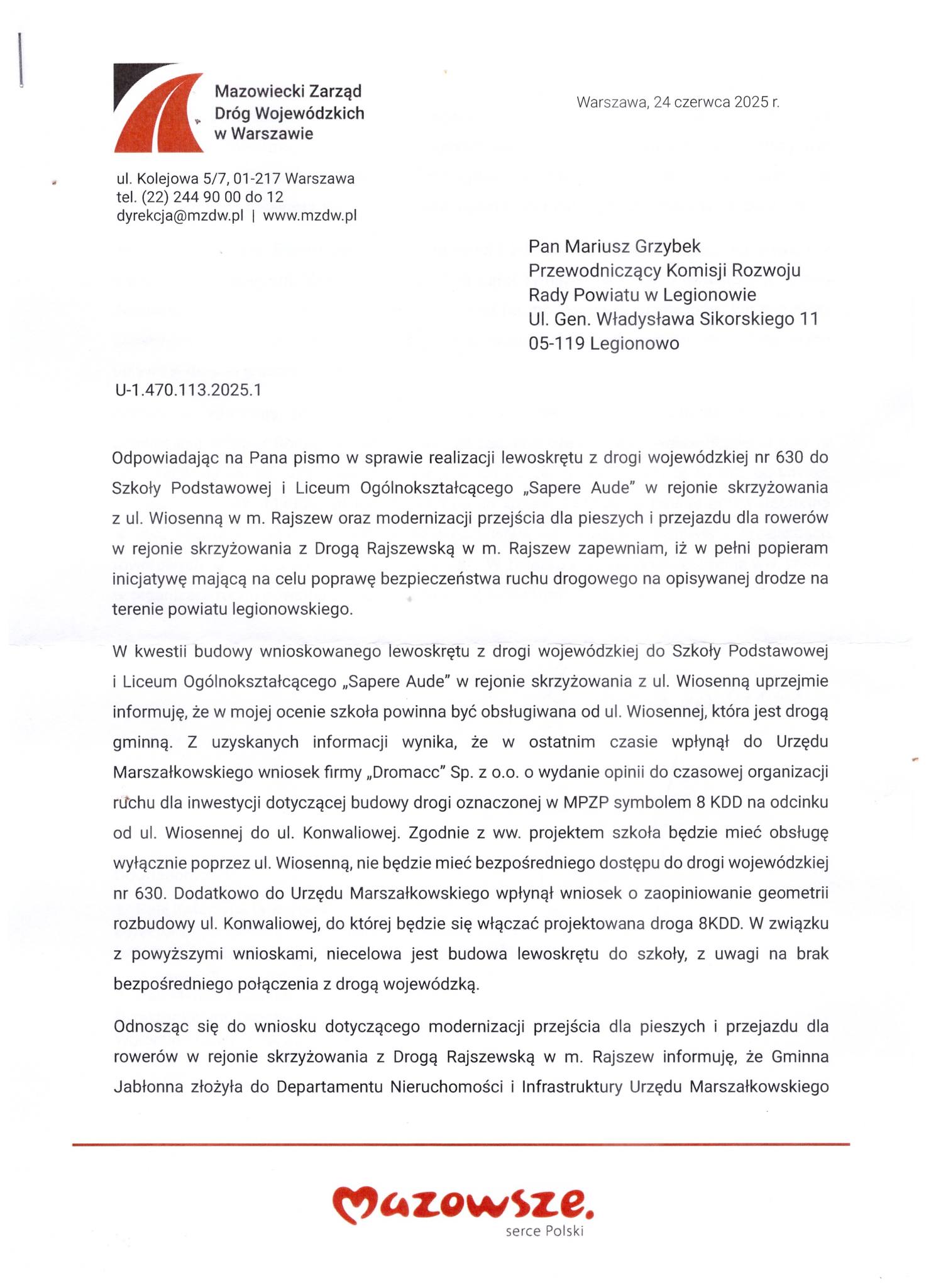 – W kwestii budowy wnioskowanego lewoskrętu z drogi wojewódzkiej do Szkoły Podstawowej i Liceum Ogólnokształcącego “Sapere Aude” w rejonie skrzyżowania z ul. Wiosenną uprzejmie informuję, że w mojej ocenie szkoła powinna być obsługiwana od ul. Wiosennej, która jest drogą gminną. Z uzyskanych informacji wynika, że w ostatnim czasie wpłynął do Urzędu Marszałkowskiego wniosek firmy “Dromacc” Sp. Z o.o. o wydanie opinii do czasowej organizacji ruchu dla inwestycji dotyczącej budowy drogi oznaczonej w MPZP symbolem 8 KDD na odcinku od ul. Wiosennej do ul. Konwaliowej. Zgodnie z ww. projektem szkoła będzie mieć obsługę wyłącznie poprzez ul. Wiosenną, nie będzie mieć bezpośredniego dostępu do drogi wojewódzkiej nr. 630. Dodatkowo do Urzędu Marszałkowskiego wpłynął wniosek o zaopiniowanie geometrii rozbudowy ul. Konwaliowej, do której będzie się włączać projektowana droga 8KDD. W związku z powyższymi wnioskami, niecelowa jest budowa lewoskrętu do szkoły, z uwagi na brak bezpośredniego połączenia z drogą wojewódzką. – przekazał w odpowiedzi na pismo Mariusza Grzybka dyrektor Mazowieckiego Zarządu Dróg Wojewódzkich w Warszawie Grzegorz Obłękowski.