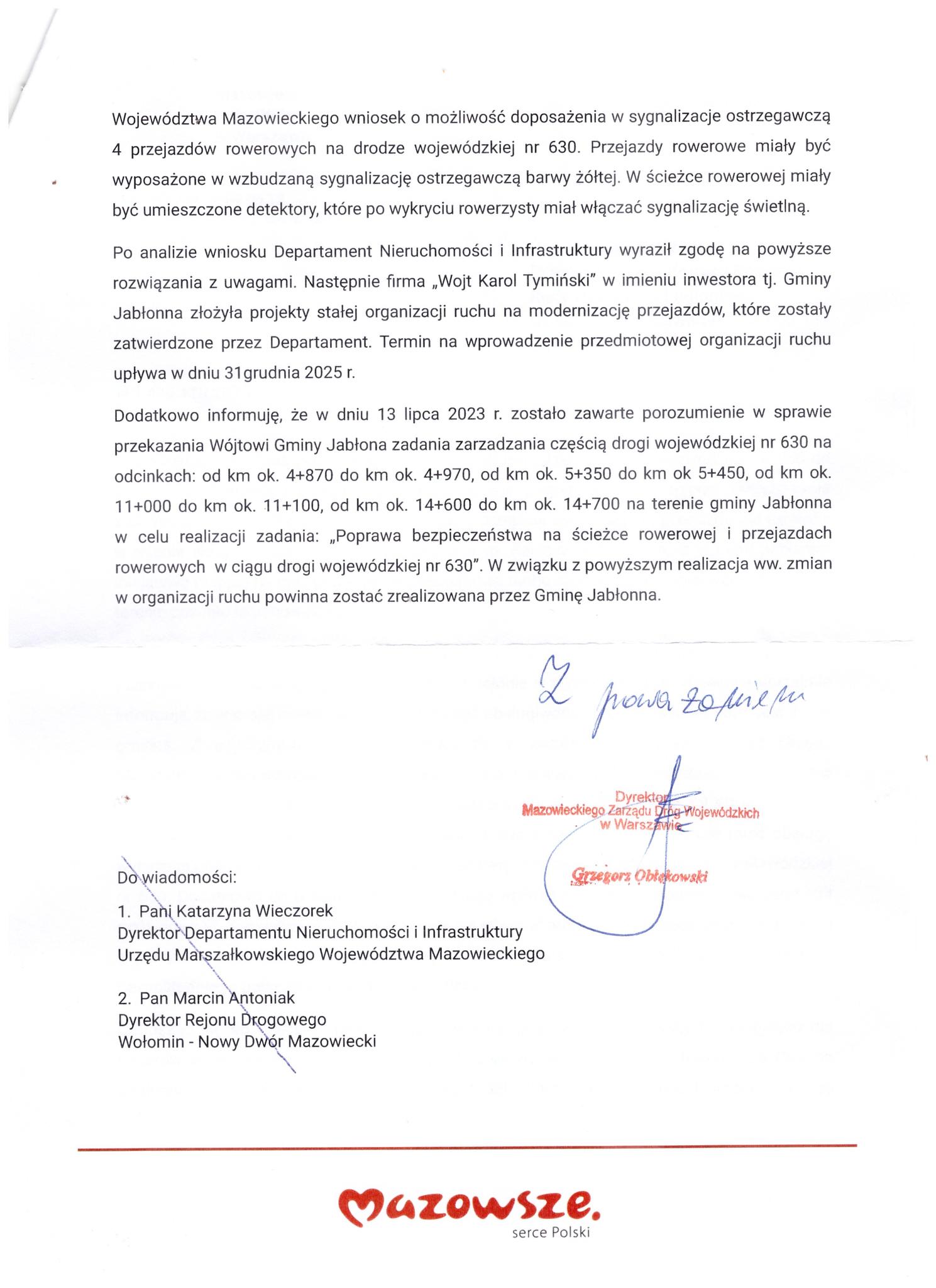 – Odnosząc się do wniosku dotyczącego modernizacji przejścia dla pieszych i przejazdu dla rowerów w rejonie skrzyżowania z Drogą Rajszewską w m. Rajszew informuję, że Gmina Jabłonna złożyła do Departamentu Nieruchomości i Infrastruktury Urzędu Marszałkowskiego Województwa Mazowieckiego wniosek o możliwość doposażenia w sygnalizację ostrzegawczą 4 przejazdów rowerowych na drodze wojewódzkiej nr 630. Przejazdy rowerowe miały być wyposażone w zbudzaną sygnalizację ostrzegawczą barwy żółtej. W ścieżce rowerowej miały być umieszczone detektory, które po wykryciu rowerzysty miał włączać sygnalizację świetlną. Po analizie wniosku Departament Nieruchomości i Infrastruktury wyraził zgodę na powyższe rozwiązania z uwagami. Następnie firma “Wojt Karol Tymiński” w imieniu inwestora tj. Gminy Jabłonna złożyła projekt stałej organizacji ruchu na modernizację przejazdów, które zostały zatwierdzone przez Departament. Termin na wprowadzenie przedmiotowej organizacji ruchu upływa w dniu 31 grudnia 2025 r. – dodał w przesłanym do wiceprzewodniczącego Rady Powiatu Legionowskiego piśmie dyrektor MZDW w Warszawie.