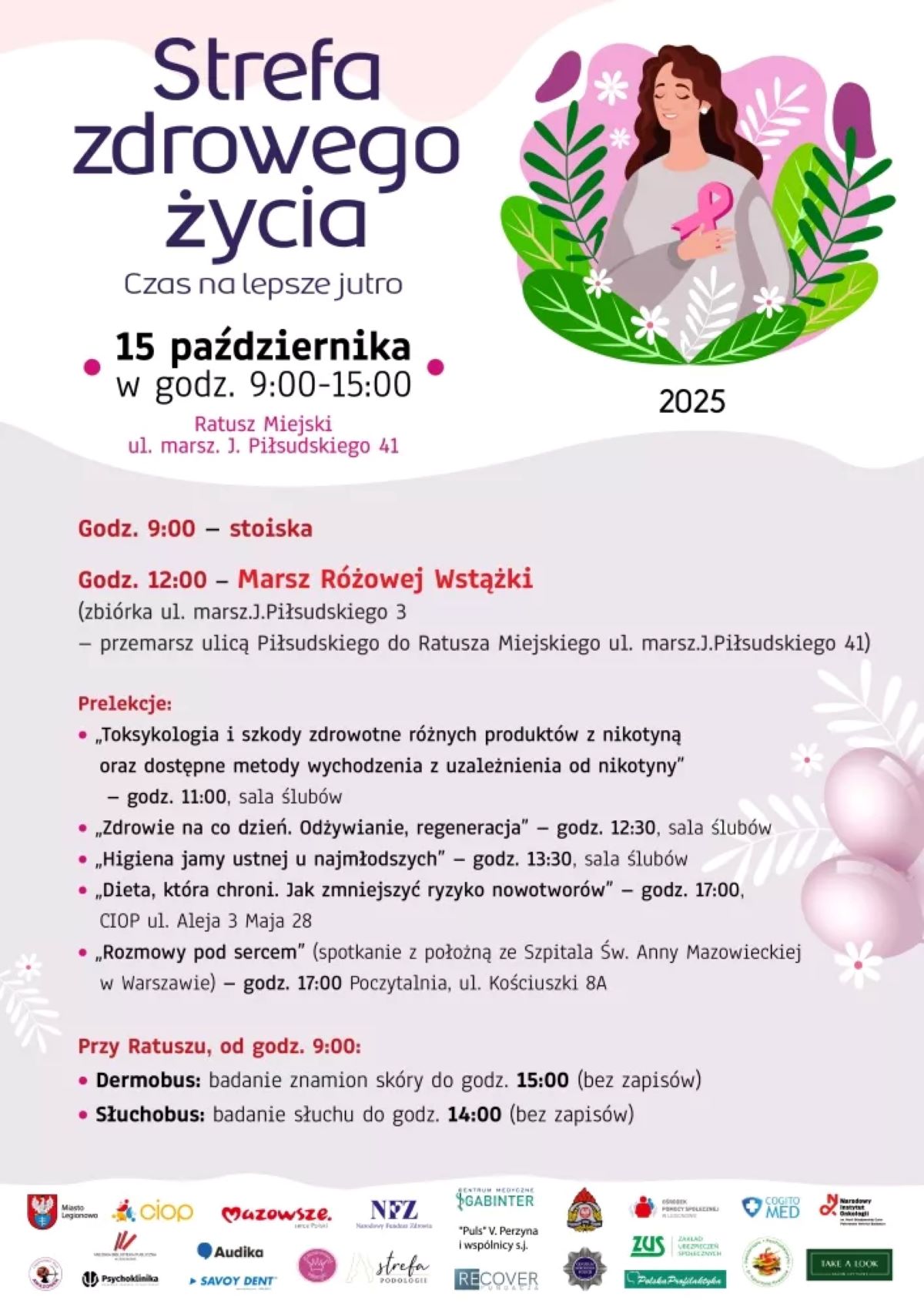 Oprócz 12. Marszu Różowej Wstążki, w środę, 15 października 2025 r. w godzinach pomiędzy 9, a 15 w gmachu miejscowego ratusza oraz w Poczytalni na dworcu na legionowianki i legionowian czekał będzie również jeszcze szereg innych wydarzeń powiązanych – najkrócej mówiąc – z profilaktyką nowotworową. Legionowianki mogły za darmo nauczyć się samobadania swoich piersi. Z kolei wszyscy mieszkańcy Legionowa za darmo mogli sprawdzić stężenie cukru w swojej krwi, zmierzyć sobie ciśnienie tętnicze, obliczyć swoje BMI, poprzez pomiar ich masy ciała oraz skorzystać z jeszcze innych darmowych konsultacji i porad. Wśród nich znajdą się konsultacje dietetyczne, psychodietetyczne, stomatologiczne, fizjoterapeutyczne i podologiczne, a eksperci z Narodowego Instytutu Onkologii będą udzielać porad dotyczących rzucenia palenia oraz mierzyć stężenia tlenku węgla w wydychanym powietrzu. Dzieci i młodzież będą mogły wziąć udział w przesiewowych badaniach wzroku oraz konsultacjach logopedycznych i integracji sensorycznej. Strażacy i policjanci zaprezentują warsztaty pierwszej pomocy. Dodatkowo, przed gmachem Urzędu Miasta (UM) w Legionowie staną dermobus, w którym będzie można wykonać darmowe badania znamion skórnych oraz słuchobus, w którym również za darmo będzie można sprawdzić swój słuch.