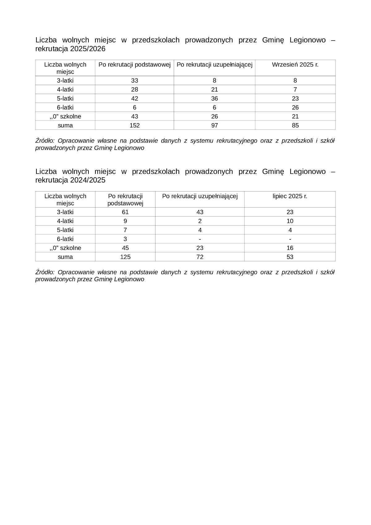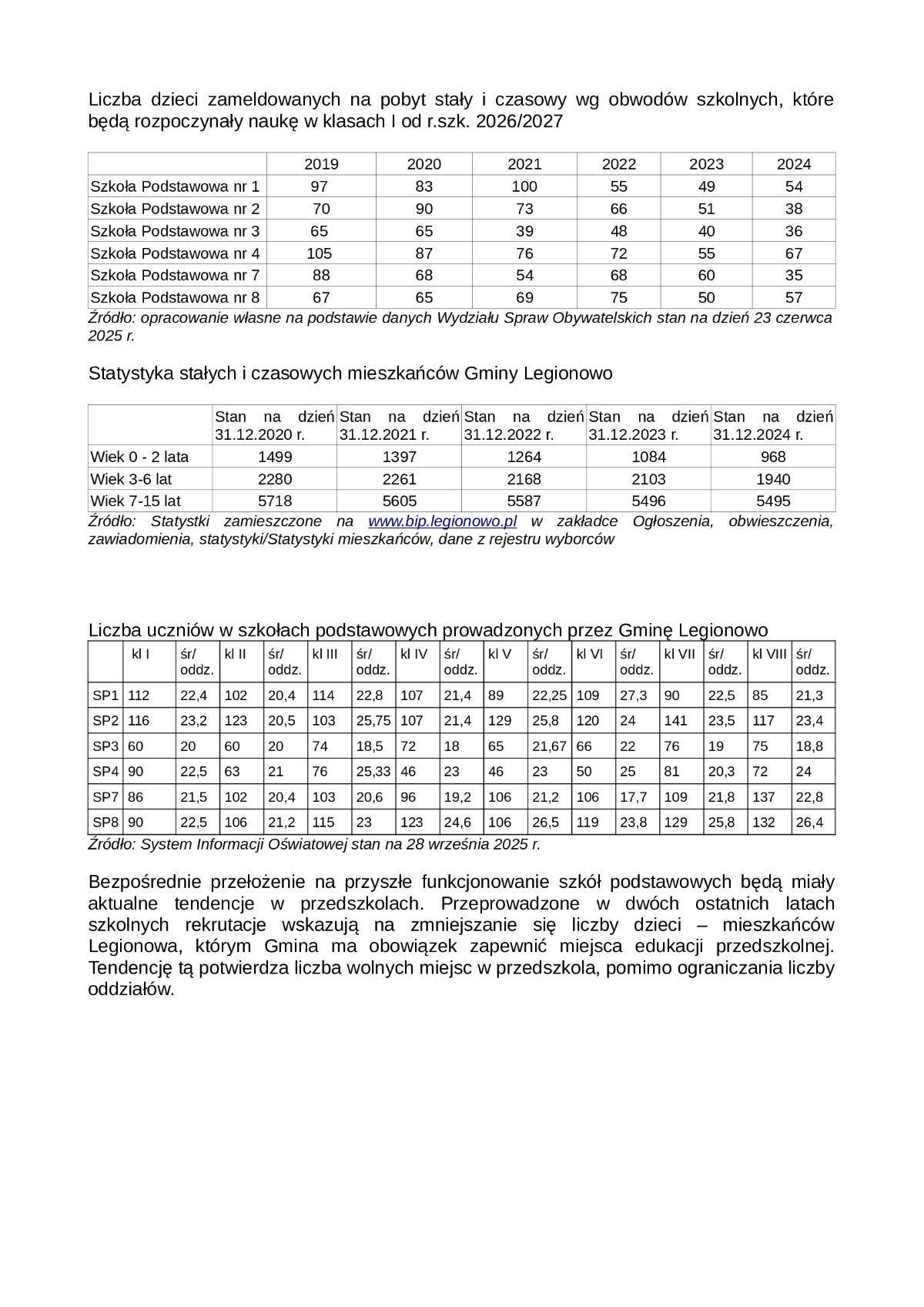 Poniżej, publikujemy grafiki przedstawiające sytuację demograficzną w legionowskich publicznych przedszkolach i szkołach podstawowych oraz jej prognozy w latach kolejnych.