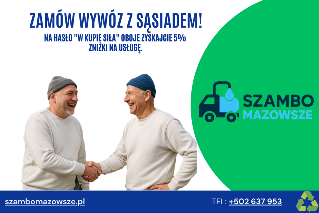 Nasza troska nie kończy się na bezpiecznym opróżnianiu zbiorników naszych klientów. Planując trasy, staramy się ograniczać emisję CO₂ oraz zużycie paliwa. Dzięki temu działamy w duchu EKO, a uzyskane oszczędności przekazujemy klientom. Dlatego uruchomiliśmy promocję sąsiedzką – jeśli umówisz się na usługę razem z sąsiadem, oboje otrzymacie 5% rabatu na hasło „W kupie siła” J. To rozwiązanie, które pozwala oszczędzić nie tylko czas i pieniądze, ale także wspiera środowisko i przy zamawianiu usługi wprowadzić uśmiech na twarze naszym klientom. W ten sposób chcemy łączyć korzyści ekologiczne z realnymi oszczędnościami dla naszych klientów” – podkreśla Aneta Franas, Dyrektor Operacyjna, www.szambomazowsze.pl.