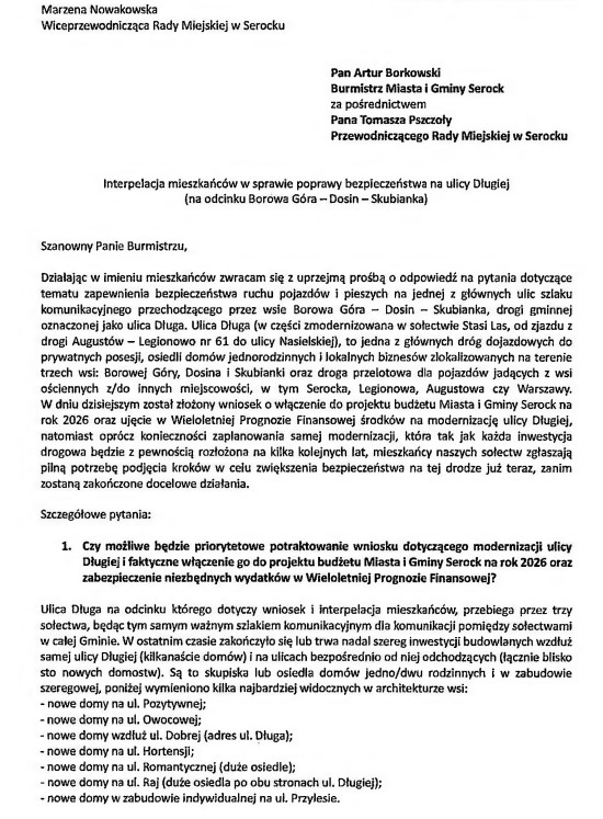 Jak dowiadujemy się z Biuletynu Informacji Publicznej Urzędu Miasta i Gminy Serock, 13 października do burmistrza Miasta i Gminy Serock Artura Borkowskiego wpłynęła interpelacja mieszkańców złożona przez Marzenę Nowakowską, wiceprzewodniczącą Rady Miejskiej w Serocku. Interpelacja skierowana do burmistrza Serocka dotyczy poprawy bezpieczeństwa na ulicy Długiej, która przechodzi przez teren aż trzech miejscowości: Borowej Góry, Dosina i Skubianki.