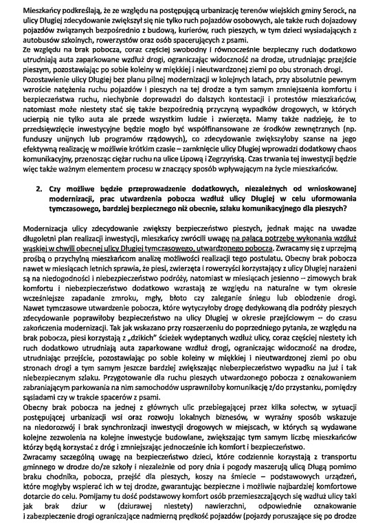 – Ulica Długa na odcinku, którego dotyczy wniosek i interpelacja mieszkańców, przebiega przez trzy sołectwa, będąc tym samym ważnym szlakiem komunikacyjnym dla komunikacji pomiędzy sołectwami w całej Gminie. W ostatnim czasie zakończyło się lub trwa nadal szereg inwestycji budowlanych wzdłuż samej ulicy Długiej (kilkanaście domów) i na ulicach bezpośrednio od niej odchodzących (łącznie blisko sto nowych domostw). Są to skupiska lub osiedla domów jedno/dwu rodzinnych i w zabudowie szeregowej (…) Mieszkańcy podkreślają, że ze względu na postępującą urbanizację terenów wiejskich gminy Serock, na ulicy Długiej zdecydowanie zwiększył się nie tylko ruch pojazdów osobowych, ale także ruch dojazdowy pojazdów związanych bezpośrednio z budową, kurierów, ruch pieszych, w tym dzieci wysiadających z autobusów szkolnych, rowerzystów oraz osób spacerujących z psami. Ze względu na brak pobocza, coraz częściej swobodny i równocześnie bezpieczny ruch dodatkowo utrudniają auta zaparkowane wzdłuż drogi, ograniczając widoczność na drodze, utrudniając przejście pieszym, pozostawiając po sobie koleiny w miękkiej i nieutwardzonej ziemi po obu stronach drogi. – czytamy w złożonym do serockiego ratusza piśmie.