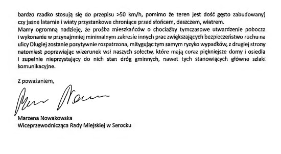 Na razie nie wiadomo czy burmistrz Miasta i Gminy Serock odniesie się pozytywnie do prośby mieszkańców o pilną poprawę bezpieczeństwa na ulicy Długiej. Odpowiedź włodarza serockiego samorządu poznamy zapewne w ciągu paru najbliższych tygodni. Poniżej pełna treść złożonej interpelacji w sprawie poprawy bezpieczeństwa na ulicy Długiej.
