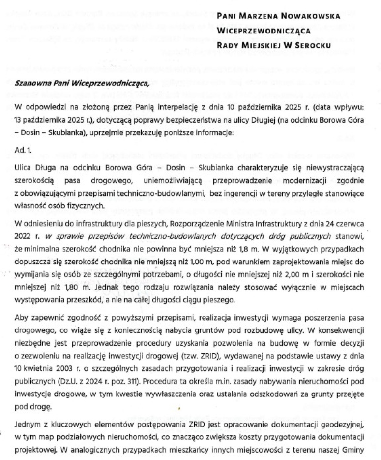 Przypomnijmy, że niecałe dwa tygodnie temu (13 października) do burmistrza Miasta i Gminy Serock Artura Borkowskiego wpłynęła interpelacja mieszkańców złożona przez Marzenę Nowakowską, wiceprzewodniczącą Rady Miejskiej w Serocku. Interpelacja skierowana do burmistrza Serocka dotyczyła poprawy bezpieczeństwa na ulicy Długiej, która przechodzi przez teren aż trzech miejscowości: Borowej Góry, Dosina i Skubianki.
