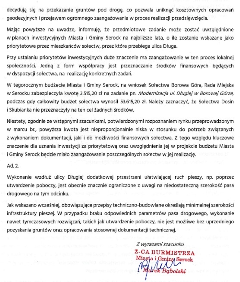 – Jednym z kluczowych elementów postępowania ZRlD jest opracowanie dokumentacji geodezyjnej, w tym map podziałowych nieruchomości, co znacząco zwiększa koszty przygotowania dokumentacji projektowej. W analogicznych przypadkach mieszkańcy innych miejscowości z terenu naszej Gminy decydują się na przekazanie gruntów pod drogę, co pozwala uniknąć kosztownych opracowań geodezyjnych i jest przejawem ogromnego zaangażowania w proces realizacji przedsięwzięcia. Mając powyższe na uwadze, informuję, że przedmiotowe zadanie może zostać uwzględnione w planach inwestycyjnych Miasta i Gminy Serock na najbliższe lata, o ile zostanie wskazane jako priorytetowe przez mieszkańców sołectw, przez które przebiega ulica Długa. – dodaje zastępca burmistrza Serocka w odpowiedzi na pytanie nr 1.